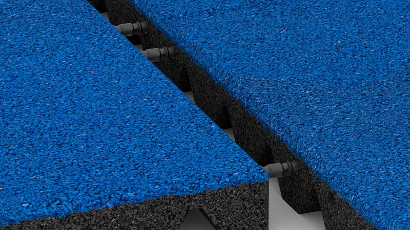 Otevřená porézní struktura vrchní vrstvy z EPDM je odolná vůči UV záření, protiskluzová a příjemná při dotyku s pokožkou – i za mokra. Spodní strana z ELT granulátu je tvarována do pravidelných pyramidových útvarů, které tlumí nárazy, odvádějí vodu a přispívají k rychlejšímu schnutí povrchu – což je výhodné při proměnlivém počasí.