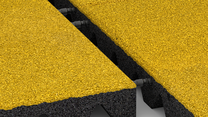 Porézní povrch z EPDM je protiskluzový, odolný vůči UV záření i opotřebení – i na mokré ploše. Díky příjemné struktuře je ideální pro místa s přímým kontaktem s pokožkou. Spodní strana je tvarována do formy obrácených komolých pyramid, které tlumí nárazy a odvádějí vodu. Díky tomu se na ploše netvoří kaluže a dlaždice rychle osychají.