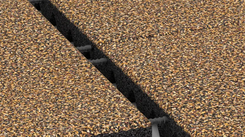 Pro venkovní použití doporučuje WARCO stabilní a vodopropustnou podkladní vrstvu. Osvědčeným řešením jsou plastové voštinové rošty (např. zatravňovací panely) nebo vázaný, drenážní podklad jako drenážní beton. Pokud podklad není propustný, je nutné zajistit spád alespoň 1,5 % pro odvod vody. Pokládka na štěrk, písek nebo drť se nedoporučuje – sypké materiály se pod elastickými deskami pohybují a ztrácejí stabilitu.
