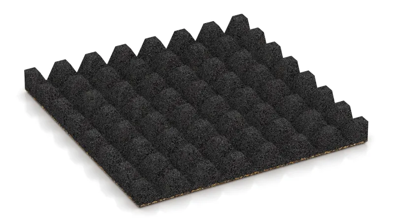 Porézní povrch z EPDM je protiskluzový, odolný vůči UV záření i opotřebení – i na mokré ploše. Díky příjemné struktuře je ideální pro místa s přímým kontaktem s pokožkou. Spodní strana je tvarována do formy obrácených komolých pyramid, které tlumí nárazy a odvádějí vodu. Díky tomu se na ploše netvoří kaluže a dlaždice rychle osychají.
