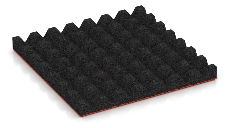 Porézní povrch z EPDM je protiskluzový, odolný vůči UV záření i opotřebení – i na mokré ploše. Díky příjemné struktuře je ideální pro místa s přímým kontaktem s pokožkou. Spodní strana je tvarována do formy obrácených komolých pyramid, které tlumí nárazy a odvádějí vodu. Díky tomu se na ploše netvoří kaluže a dlaždice rychle osychají.