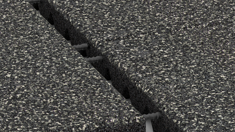Porézní povrch z EPDM je protiskluzový, odolný vůči UV záření i opotřebení – i na mokré ploše. Díky příjemné struktuře je ideální pro místa s přímým kontaktem s pokožkou. Spodní strana je tvarována do formy obrácených komolých pyramid, které tlumí nárazy a odvádějí vodu. Díky tomu se na ploše netvoří kaluže a dlaždice rychle osychají.