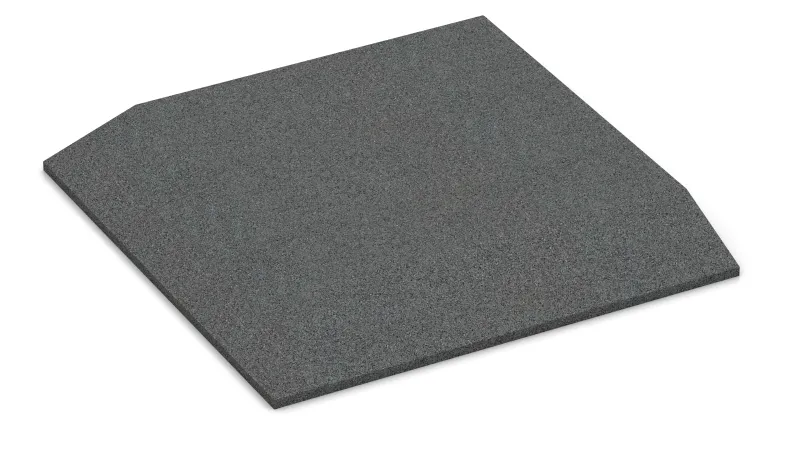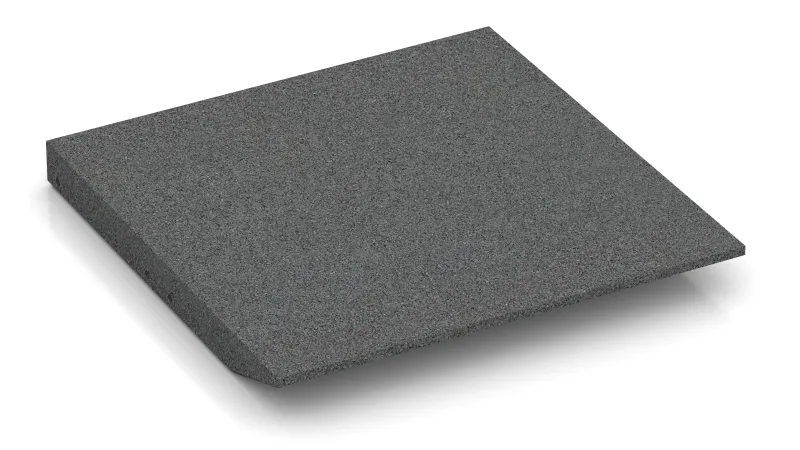 The corner tile with two chamfered sides arranged perpendicularly to each other is a useful and system-compatible addition to the rubber granulate tiles type FS. The corner tile is used between two perpendicularly situated edge tiles FI to build a corner without any trip hazard. Edge tiles and corner tiles are used if only a section of the ground should be covered with rubber granulate plates. Usage of the corner tile helps smoothly compensate the level difference between the ground and the rubber slabs surface. That's how the danger of accident can be reduced.