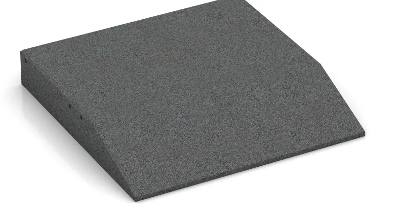 The edge tile with one chamfered side is a useful and system-compatible addition to the rubber granulate tiles type FS. The edge tile is used for avoiding trip hazard that can occur at the transition to the rubber granulate surface in case only one section is paved with rubber granulate slabs. It also helps compensate the level difference between the ground and rubber plates surface. Trip accidents can be avoided and smooth driving on it with a wheelchair, a baby buggy or a rollator is possible.