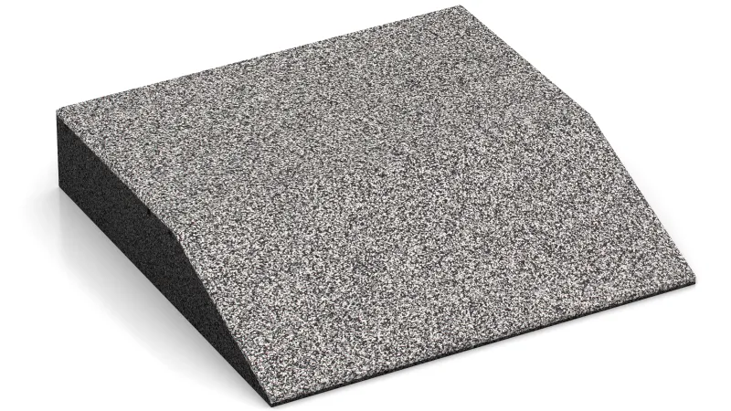 The edge tile with one chamfered side is a useful and system-compatible addition to the rubber granulate tiles type FS. The edge tile is used for avoiding trip hazard that can occur at the transition to the rubber granulate surface in case only one section is paved with rubber granulate slabs. It also helps compensate the level difference between the ground and rubber plates surface. Trip accidents can be avoided and smooth driving on it with a wheelchair, a baby buggy or a rollator is possible.