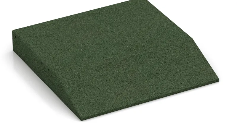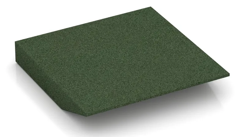 The edge tile with one chamfered side is a useful and system-compatible addition to the rubber granulate tiles type FS. The edge tile is used for avoiding trip hazard that can occur at the transition to the rubber granulate surface in case only one section is paved with rubber granulate slabs. It also helps compensate the level difference between the ground and rubber plates surface. Trip accidents can be avoided and smooth driving on it with a wheelchair, a baby buggy or a rollator is possible.