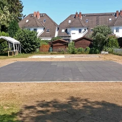 - A large soccer field or basketball court is laid on plastic honeycomb grids with or without frost protection, depending on the surface. Ball tiles with a thickness of 40 mm are used as the playing surface.