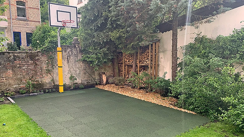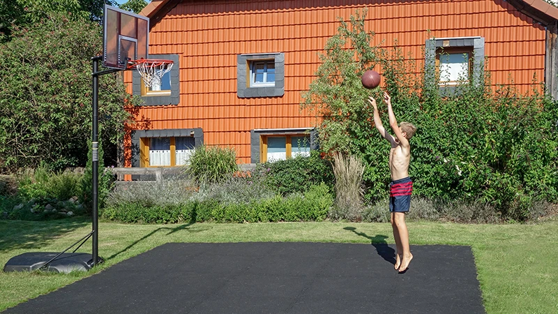 For a basketball hoop on the house wall or carport, simply lay 18 mm thick sports floor panels on the concrete interlocking pavement or driveway asphalt.