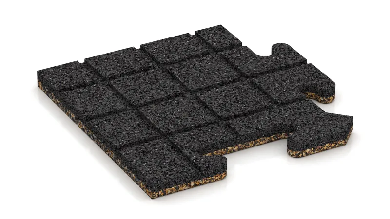Rohová dlaždice HD zaručuje přesné a trvanlivé zakončení rohů ploch vyložených dlaždicemi s vysokou hustotou. Každý prvek představuje čtvrtinu celé puzzle dlaždice: vnitřní strany mají charakteristický puzzle zámek a přesně zapadají do ostatních dlaždic, zatímco vnější strany jsou rovné a tvoří čistou ukončovací hranu. Výsledkem je robustní a vizuálně jednotný rám kolem celé plochy.