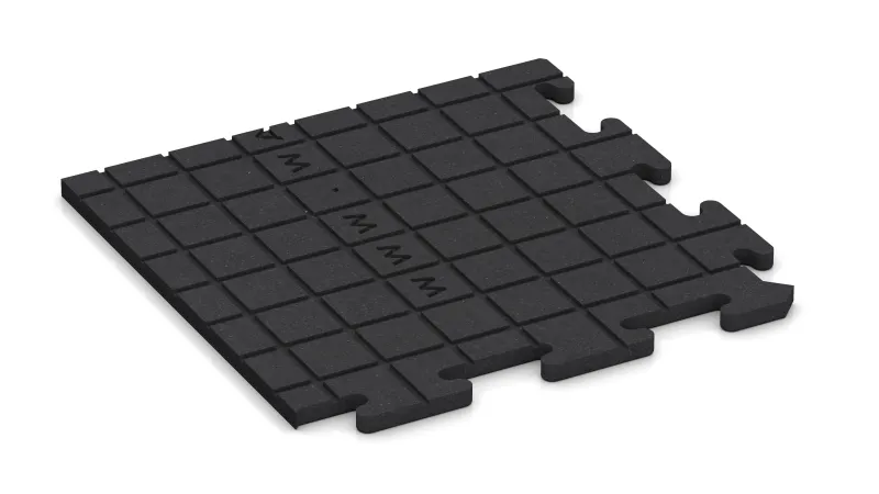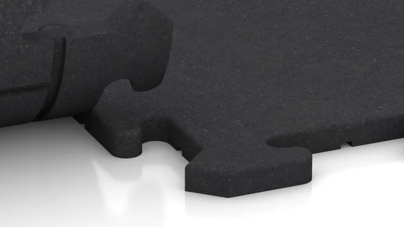 Dlaždice se pokládají volně na rovný podklad a spojují se pomocí puzzle zámku. Tím vzniká čisté a přesné zakončení rohů bez nutnosti dodatečného řezání. Rovné hrany a lehce zkosené okraje vytvářejí jednotný a profesionální vzhled, vhodný jak pro dočasné, tak i pro trvalé instalace.