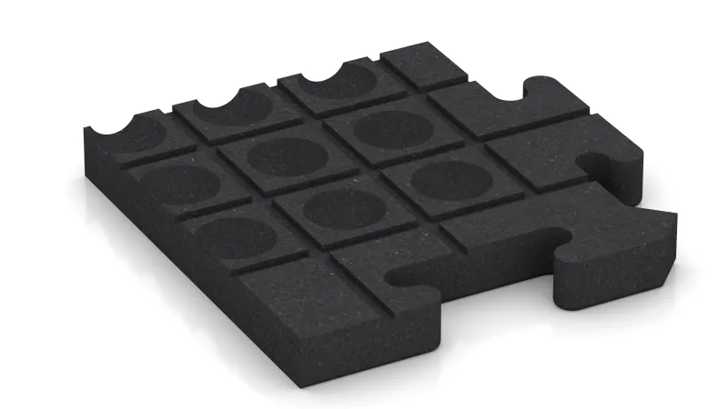 Dlaždice se pokládají volně na rovný podklad a spojují se pomocí puzzle zámku. Tím vzniká čisté a přesné zakončení rohů bez nutnosti dodatečného řezání. Rovné hrany a lehce zkosené okraje vytvářejí jednotný a profesionální vzhled, vhodný jak pro dočasné, tak i pro trvalé instalace.