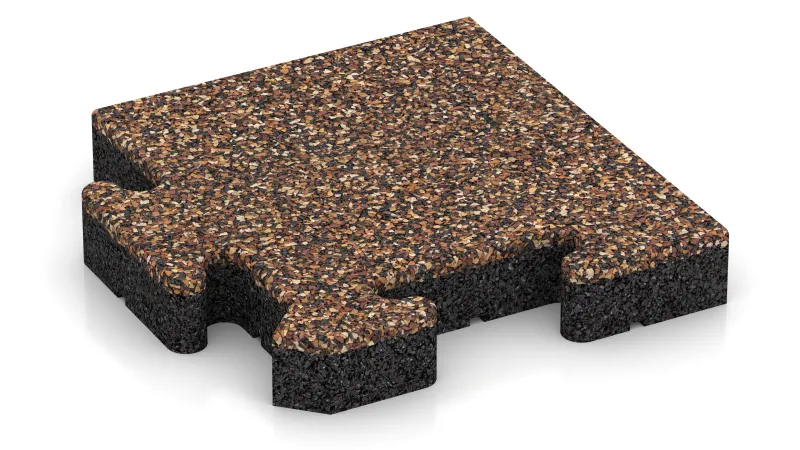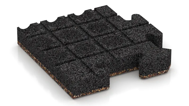 Rohová dlaždice HD zaručuje přesné a trvanlivé zakončení rohů ploch vyložených dlaždicemi s vysokou hustotou. Každý prvek představuje čtvrtinu celé puzzle dlaždice: vnitřní strany mají charakteristický puzzle zámek a přesně zapadají do ostatních dlaždic, zatímco vnější strany jsou rovné a tvoří čistou ukončovací hranu. Výsledkem je robustní a vizuálně jednotný rám kolem celé plochy.