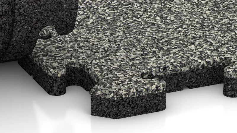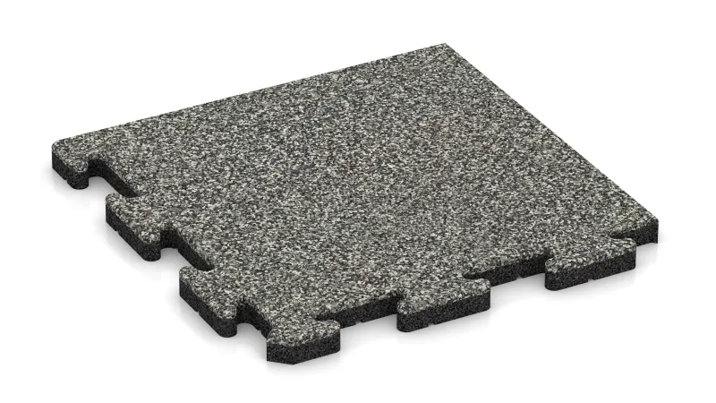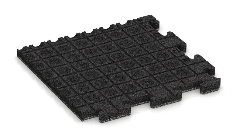 Rohová dlaždice HD zaručuje přesné a trvanlivé zakončení rohů ploch vyložených dlaždicemi s vysokou hustotou. Každý prvek představuje čtvrtinu celé puzzle dlaždice: vnitřní strany mají charakteristický puzzle zámek a přesně zapadají do ostatních dlaždic, zatímco vnější strany jsou rovné a tvoří čistou ukončovací hranu. Výsledkem je robustní a vizuálně jednotný rám kolem celé plochy.
