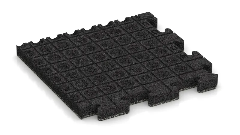 Rohová dlaždice HD zaručuje přesné a trvanlivé zakončení rohů ploch vyložených dlaždicemi s vysokou hustotou. Každý prvek představuje čtvrtinu celé puzzle dlaždice: vnitřní strany mají charakteristický puzzle zámek a přesně zapadají do ostatních dlaždic, zatímco vnější strany jsou rovné a tvoří čistou ukončovací hranu. Výsledkem je robustní a vizuálně jednotný rám kolem celé plochy.